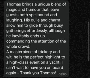 I perform at a wide range of events — from weddings, corporate functions, and private parties to festivals, special celebrations and even brand activation. Whether it’s an intimate dinner or a large-scale event, I adapt my magic to suit the atmosphere.