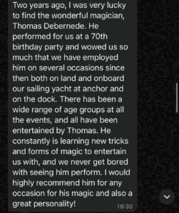 For close-up magic, very little — just your guests and some space to move around. For stage shows, I usually need a small performance area, a microphone, and good lighting. I’ll discuss all details with you before the event.