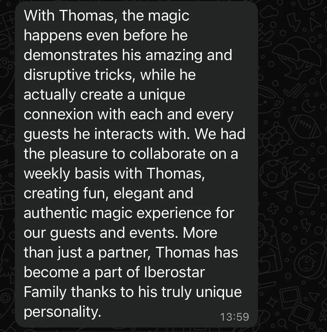 My name’s Thomas. I’ve been a magician and mentalist for the last ten years, and a full-time traveler for the last five. I’ve been lucky to perform everywhere — from Paris to Mallorca, Dubai to Bangkok, New York, London, Switzerland, and Spain. Honestly, I just feel blessed to do what I do.