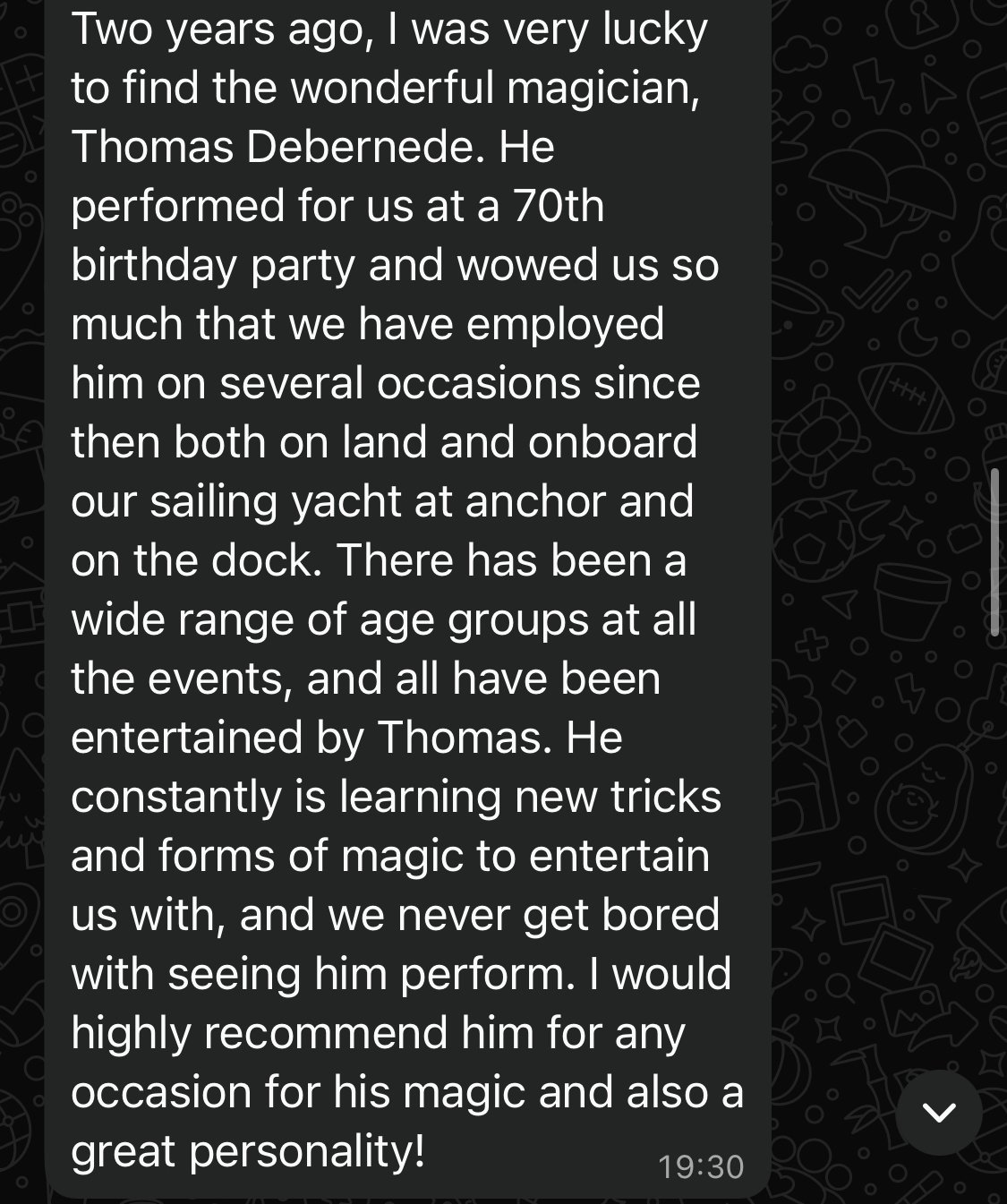 Every event is unique. I work closely with you to ensure the magic perfectly complements your celebration's style and flow.